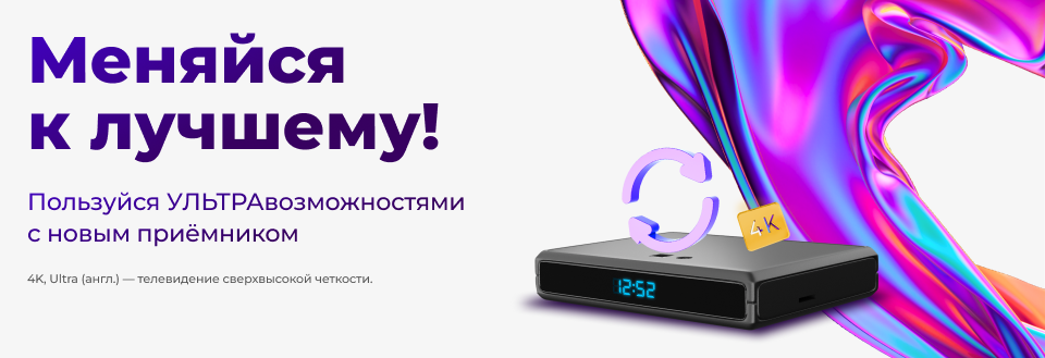 Смотри контент в сверхвысоком качестве с UHD-приёмником с первого дня после обмена, а также множество сериалов и тысячи фильмов в онлайн-кинотеатре всего за 5500 руб. Остаток дней основной услуги трансформируется в дни подписки на «Единый Ultra» без доплат.